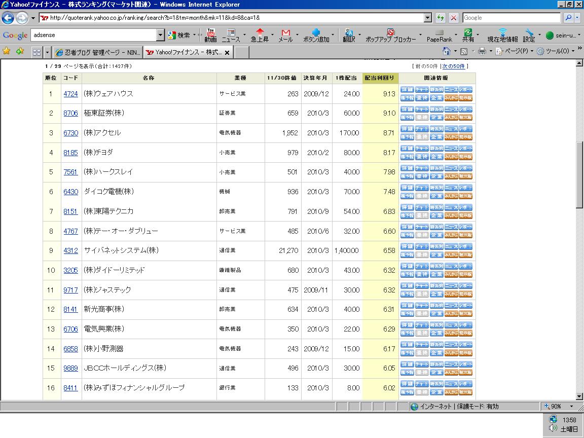 Yahoo!ファイナンス > 株式 >株式ランキング、で配当利回りをキーとします。