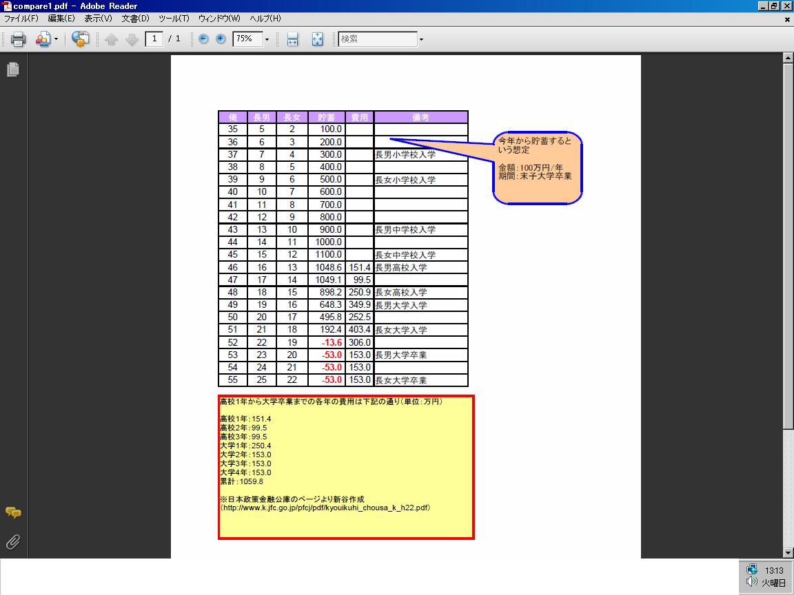毎年の100万の教育費貯蓄に加え、生活費等より教育費を充当するという状態に。
