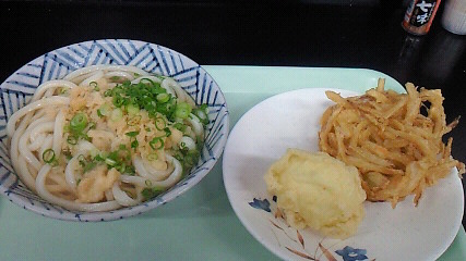 <明石屋> かけうどん小180円+ハムエッグ天80円+げそ天100円=360円